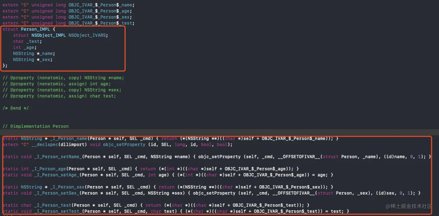 static NSString * _I_Person_sex(Person * self, SEL _cmd) { return (*(NSString **)((char *)self + OBJC_IVAR_$_Person$_sex)); }