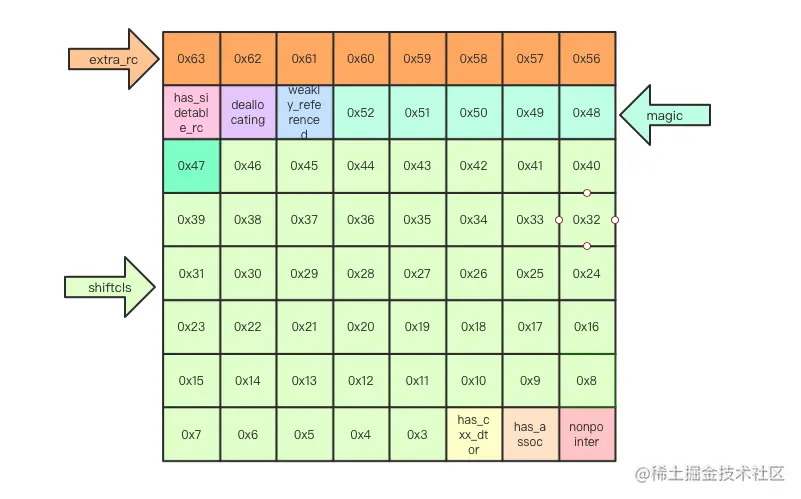 extra_rc:(存储在第45-63字节。):存放该对象的引用计数值减1后的结果。对象的引用计数超过 1,会存在这个里面,如果引用计数为 10,extra_rc 的值就为9。
