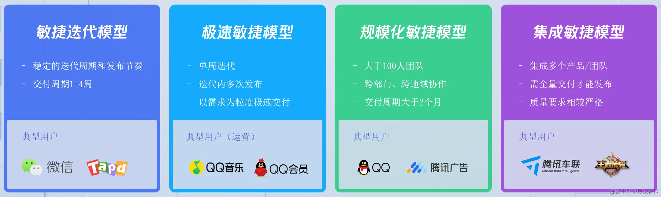 在对内服务期间,TAPD 在提升团队协作效率的同时,帮助团队敏捷自适应,实现资源透明共享,消除信息孤岛,用高效的分布式协作,突破协作瓶颈。不仅支撑了腾讯敏捷发展的思想落地,也沉淀、固化了腾讯最优秀的团队敏捷实践,逐渐形成了有腾讯特色的四种研发模型:从稳定迭代到极速发版,从规模化到集成化,不管是QQ、微信还是王者荣耀,不同的业务场景都能找到适合自己的敏捷研发模型。