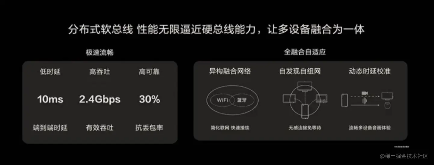如下图,分布式软总线是整个鸿蒙系统的底座,其性能无限逼近硬总线的能力,让多设备可以融为一体,让系统极速流畅。