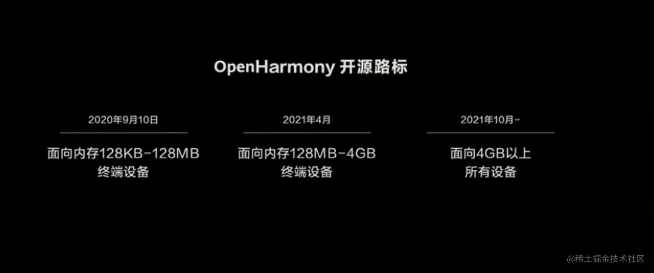 与此同时,余承东宣布将鸿蒙 OS 的代码捐赠给开放原子开源基金会进行开源孵化,并公布了鸿蒙系统的开源路标:9 月 10 日,即从今天起,鸿蒙系统将面向大屏、手表、车机等 128KB-128MB 终端设备开源;2021 年 4 月,面向内存 128MB-4GB 终端设备开源;2021 年 10 月,将面向 4GB 以上所有设备开源。