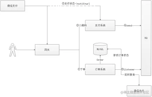 为了实现支付的功能,这里选择接入微信支付。流程就是我们通过订单系统下单,然后订单系统调用支付系统去向微信支付的服务器发送请求,然后获取二维码返回给用户,然后订单系统就开始监听MQ。用户扫码支付后,支付系统将支付状态存进MQ中。订单系统检测到用户已经付钱了,就将订单设为已支付,然后存进MySQL中。可能会因为网络问题导致订单系统获取不到支付状态,所以订单系统会定时向微信支付服务器发送请求去查询订单状态。