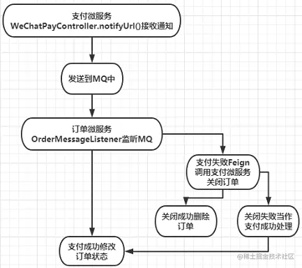 当创建一个订单后,可能用户并不会去支付,或者是因为网络的原因导致我们获取不到用户支付的结果。所以可以采用定时处理的方式,具体的操作就是下单成功后就往mq的队列1中发送一条消息,设置30分钟过期,过期后将消息发送给队列2,然后我们监听队列2。这样一旦监听到了队列2的消息,则说明离下单已经过去了30分钟,这时候我们去查询一下订单状态,如果是已支付就不去管它,要是未支付的话就通知微信服务器关闭订单,然后从数据库中删除订单。为了方便理解,我画了一张流程图:
