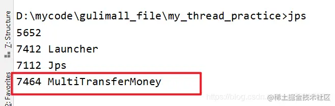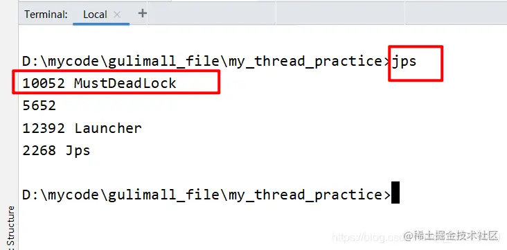 首先用jps 找出当前运行程序的PID, 可以看到我们自己运行的类MustDeadLock的PID为10052