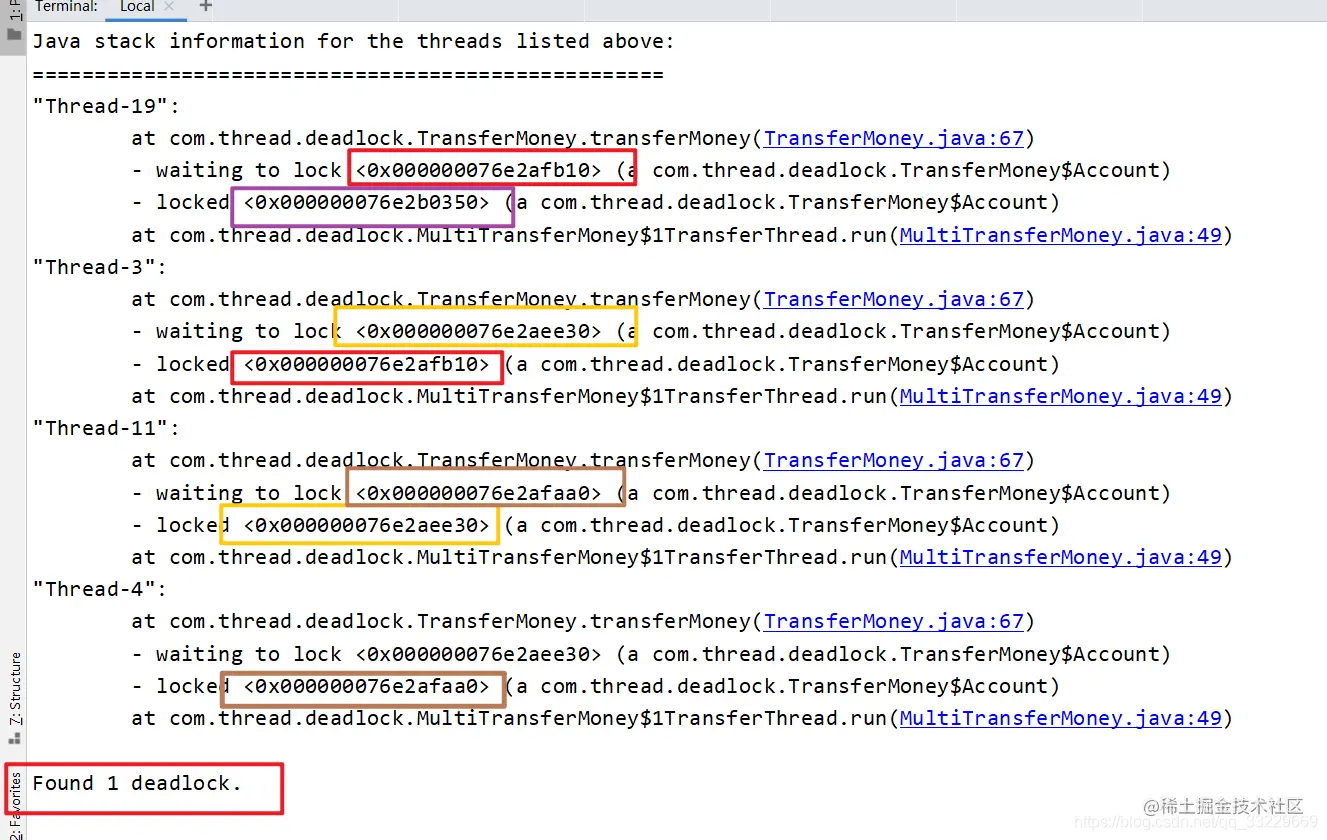 线程1持有0x000000076e471818这把锁, 需要0x000000076e471808这把锁.
