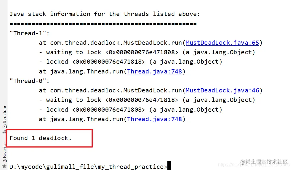 jstack 10052 可以看到打印出来了线程间死锁的信息.