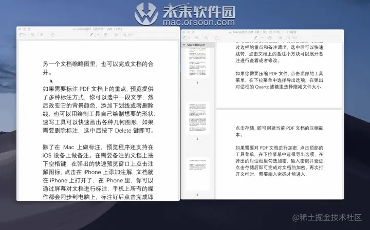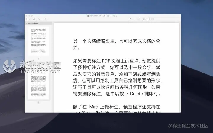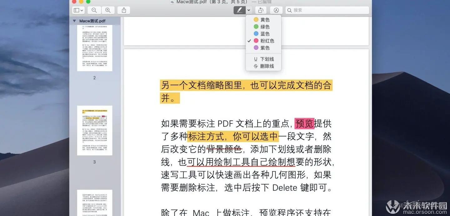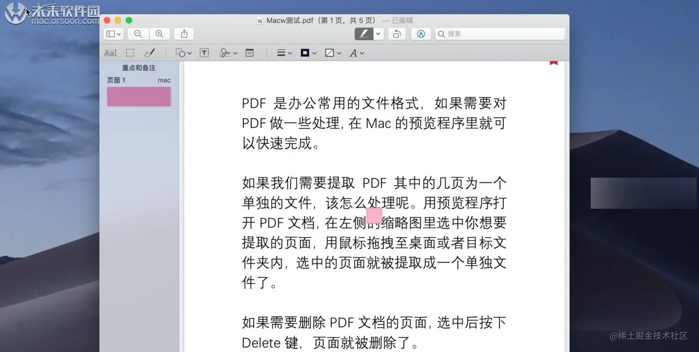 如果需要标注PDF文档上的重点,预览提供了多种标注方式,你可以选中一段文字,然后改变它的背景颜色,添加下划线或者删除线,也可以用绘制工具自己绘制想要的形状,速写工具可以快速画出各种几何图形,如果需要删除标注,选中后按下Delete键即可。