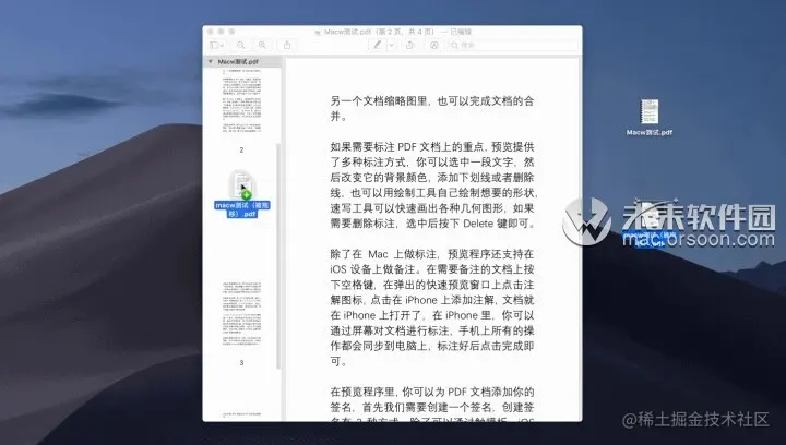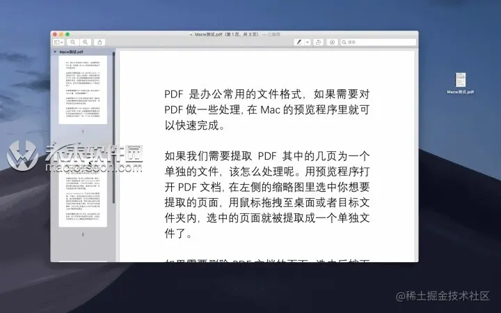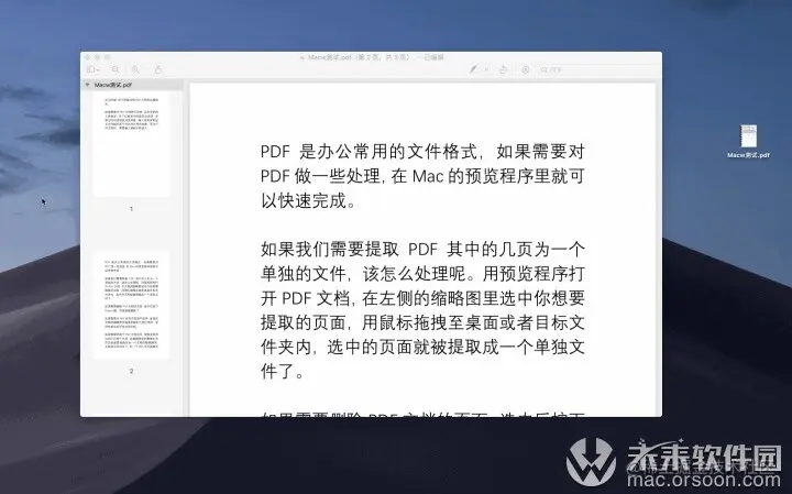 PDF是办公常用的文件格式,如果需要对PDF做一些处理,在Mac的预览程序里就可以快速完成。如果我们需要提取PDF其中的几页为一个单独的文件,该怎么处理呢。用预览程序打开PDF文档,在左侧的缩略图里选中你想要提取的页面,用鼠标拖拽至桌面或者目标文件夹内,选中的页面就被提取成一个单独文件了。