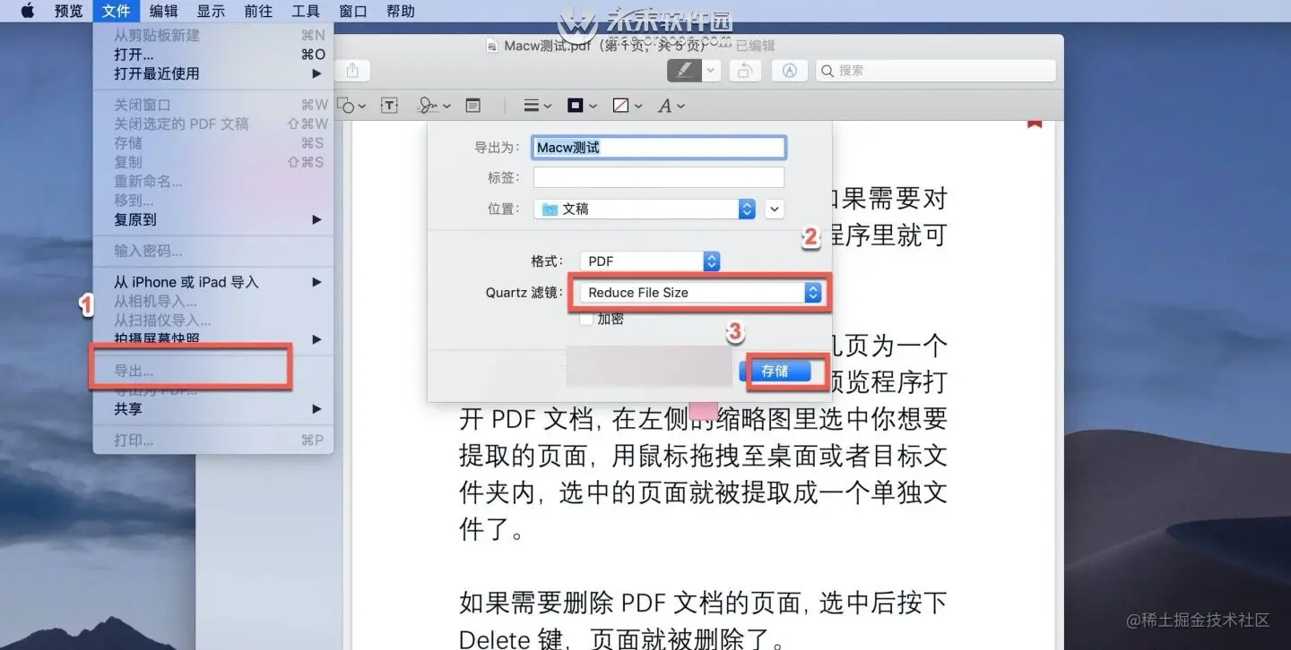 如果你需要压缩PDF文件,点击顶部的文件菜单,在下拉菜单中选择导出选项,在弹出对话框的Quartz滤镜里选择Reduce File Size,点击存储,即可创建当前PDF文档的压缩副本。