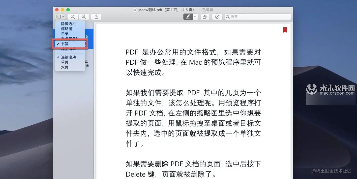 如果你在阅读一份PDF文档的时候,读到一半想下次继续阅读,按下Command+D即可为文档添加标签,下次打开文档时,点击工具栏最左侧的边栏图标,选择对应书签,即可快速定位到书签的位置。
