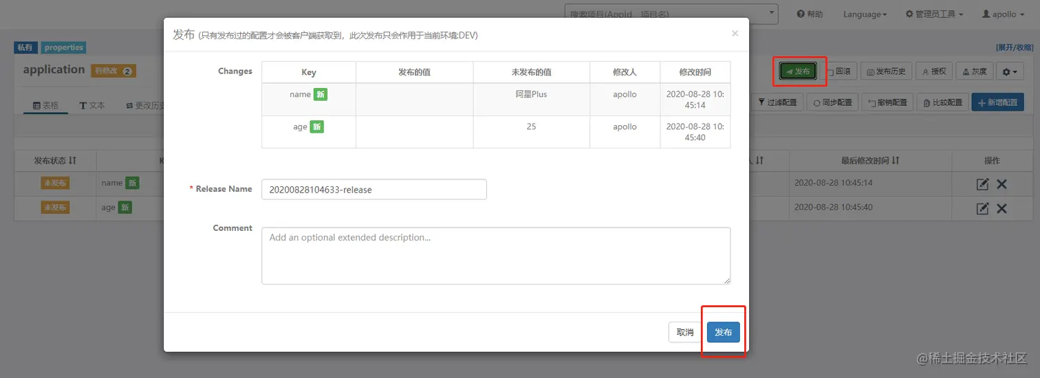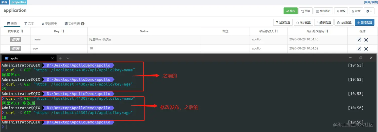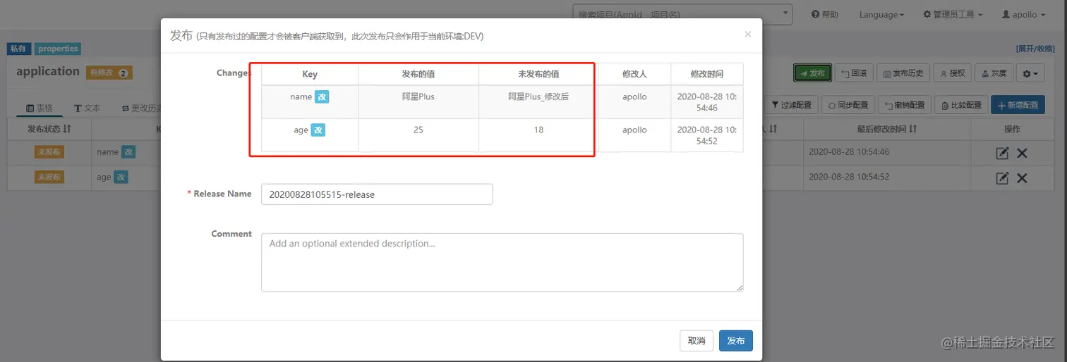 然后修改name和age的值,在调用接口看看。注意在Apollo中修改后,需要发布才会生效。