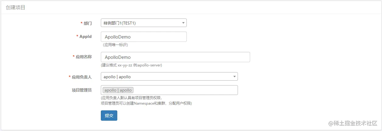然后我们在Apollo管理界面新建一个与配置在appsettings.json中AppId同名的项目ApolloDemo。
