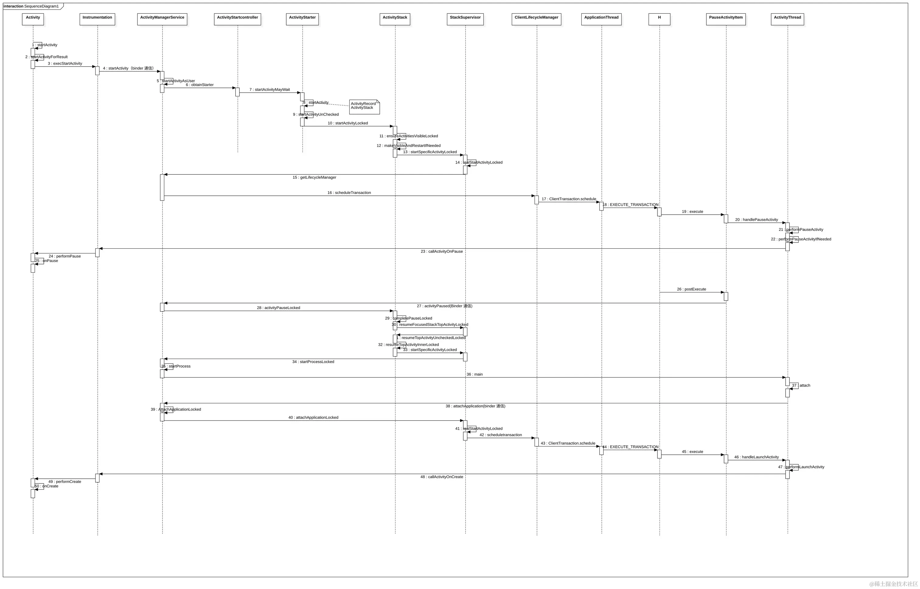 - Activity startActivity 调用 startActivityForResult, 再调用Instrument execStartActivity, 再通过binder 对象 ActivityManagerProxy 调用ActivityManagerService, 在AMS中有ActivityStack 管理Activity 栈,通过权限检查后,通过ApplicationThread binder 通知activity1 onpause.