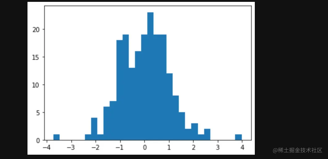 在直方图当中我们只需要传入一个数组,就是我们要求分布的数组,另外我们需要再输入一个参数bins,表示我们希望将数据分桶的数量。然后它会绘制出每个桶中数据数量的直方图,这样我们就可以很直观地看出分布来了。