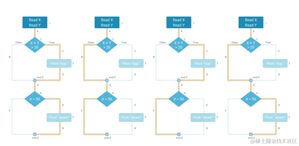 路径测试是一种结构测试方法,涉及使用程序的源代码来查找每个可能的可执行路径。路径覆盖范围可确保从头到尾覆盖所有路径。在此示例中,有四种可能的路径: