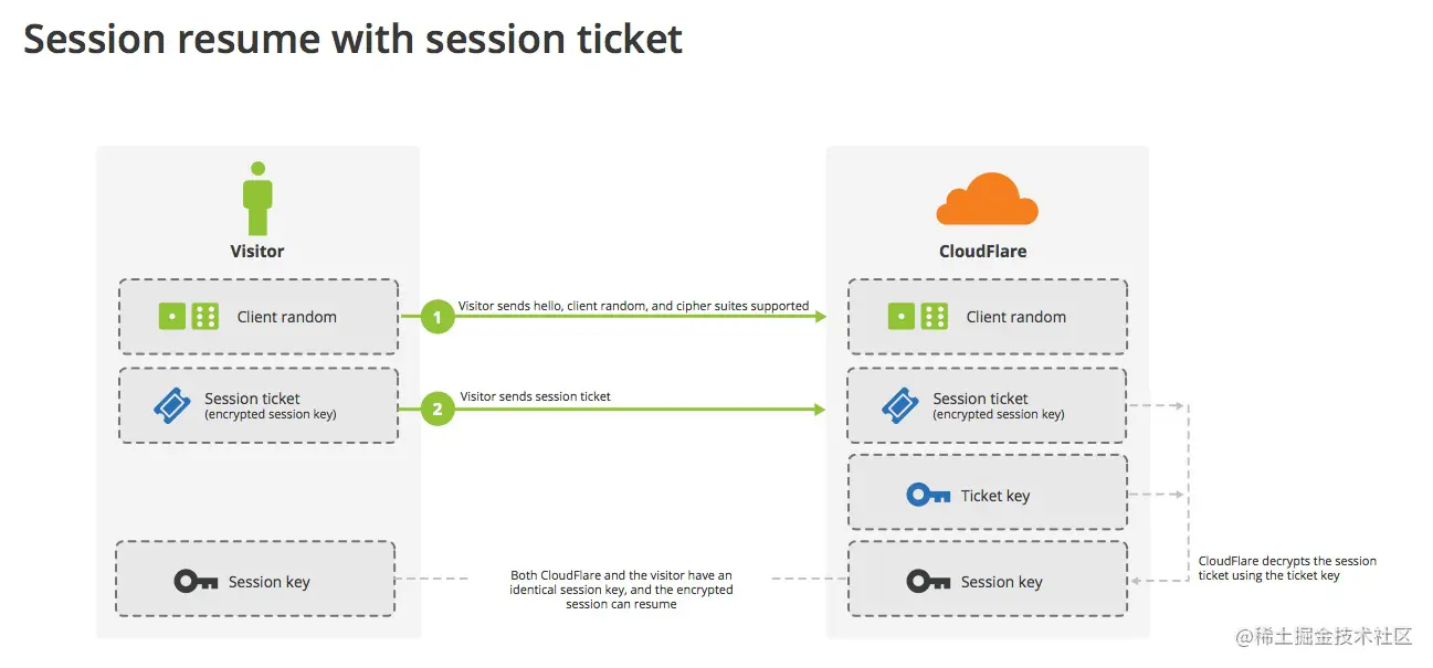 上图中,客户端不再发送session ID,而是发送一个服务器在上一次对话中发送过来的session ticket。这个session ticket是加密的,只有服务器才能解密,其中包括本次对话的主要信息,比如对话密钥和加密方法。当服务器收到session ticket以后,解密后就不必重新生成对话密钥了。