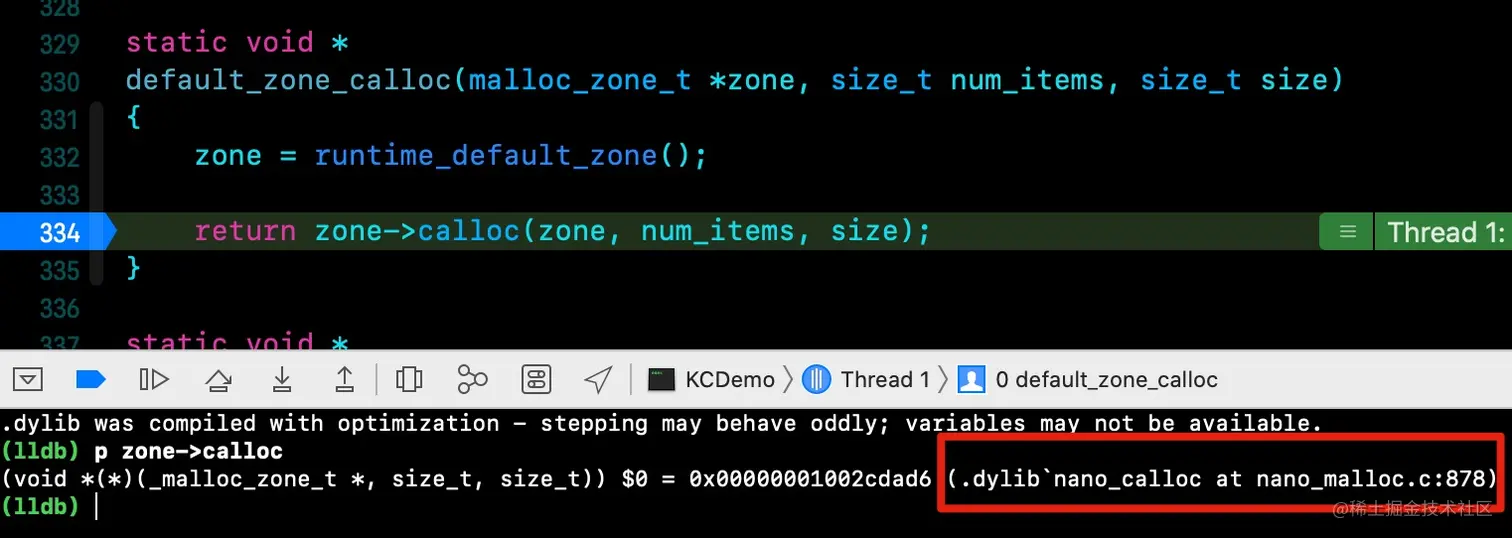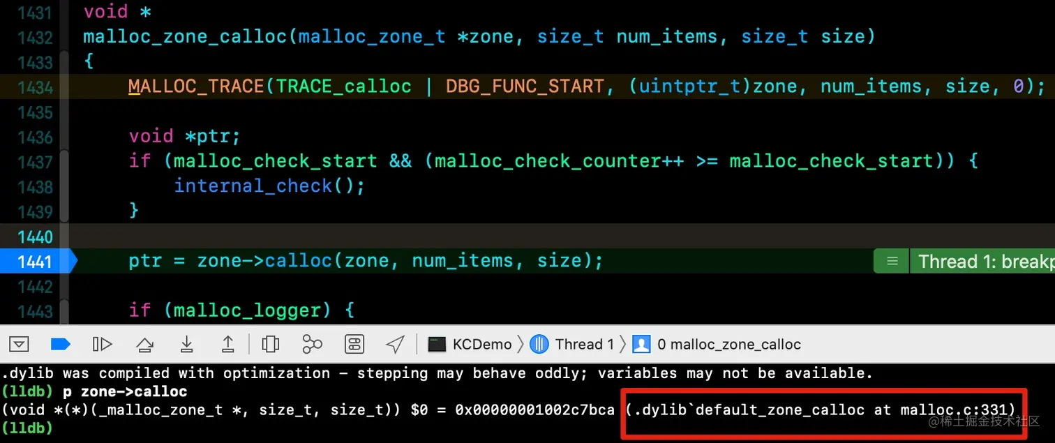 - 在ptr = zone->calloc(zone, num_items, size)处打个断点,运行代码,这里有两种方式是代码往下走: