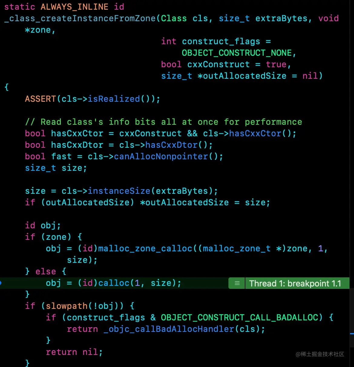 - 我们先从alloc源码中找到obj = (id)calloc(1, size),主要涉及的方法alloc --> _objc_rootAlloc --> callAlloc --> _objc_rootAllocWithZone --> _class_createInstanceFromZone