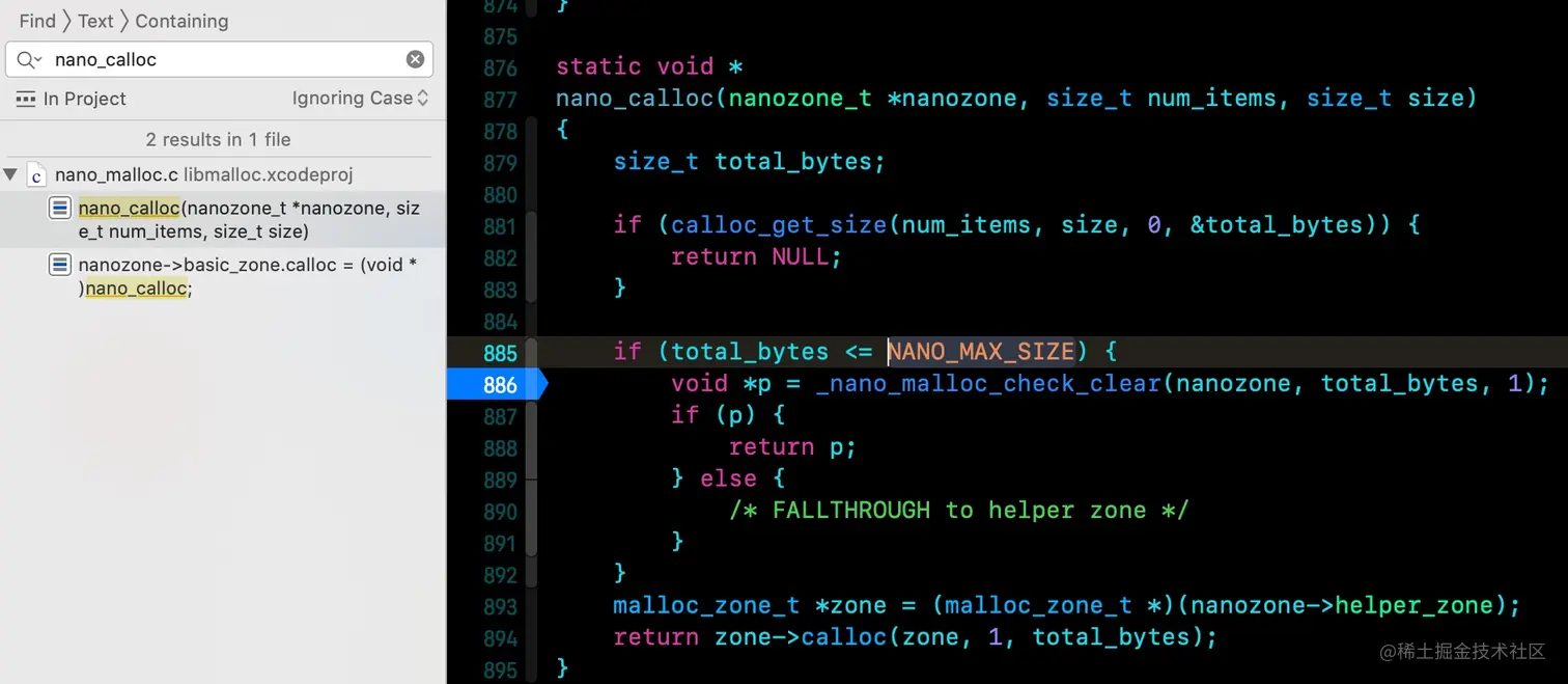 - 关键代码886行,如果size小于NANO_MAX_SIZE,则去请了一个指针p,并且将这个指针返回。