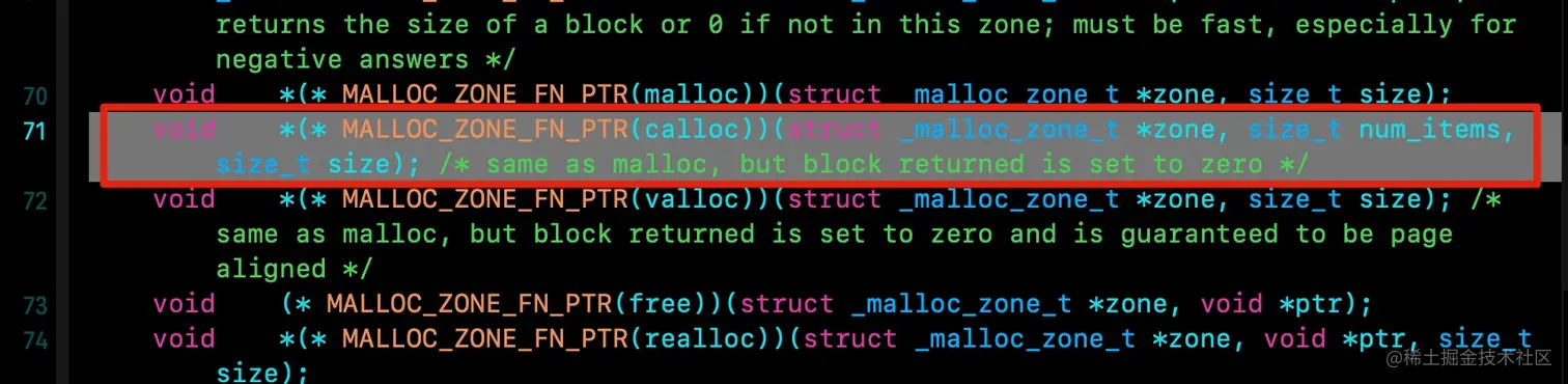 - 通过对源码的分析,可以发现关键的代码是:ptr = zone->calloc(zone, num_items, size);