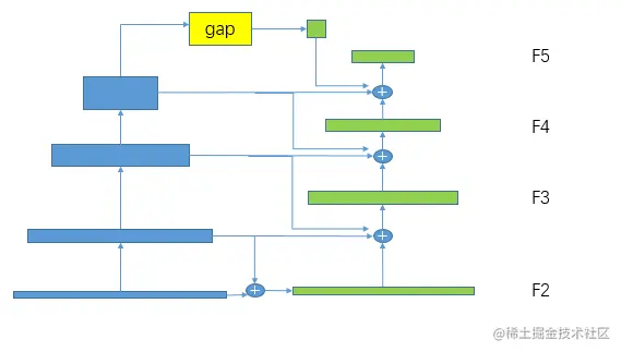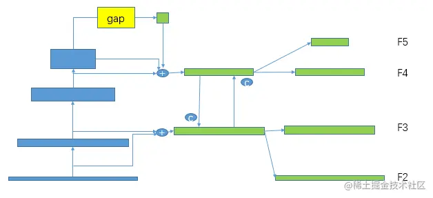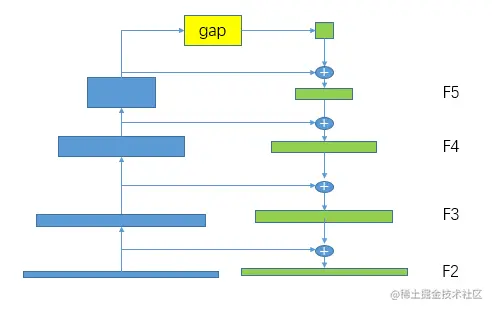 | Top-down FPN | 对检测和识别小物体有较大帮助 | 由高层特征逐层向低层特征构建,在文中作者对原始FPN做了改动,在最高层增加了一个GAP提取全局信息 |