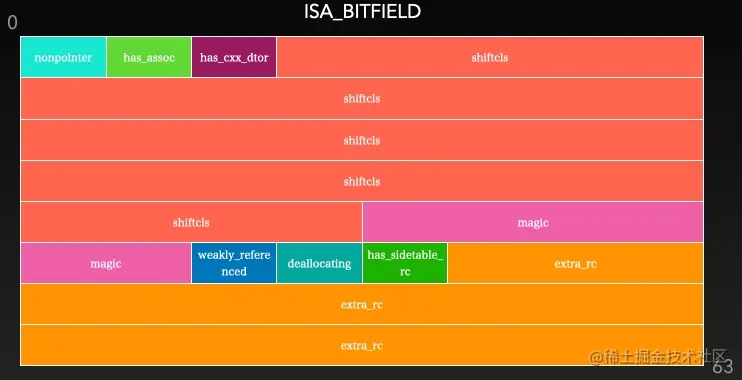 | shiftcls | 存储类指针的值。开启指针优化的情况下,在 arm64 架构中有 33 位用来存储类指针。 |