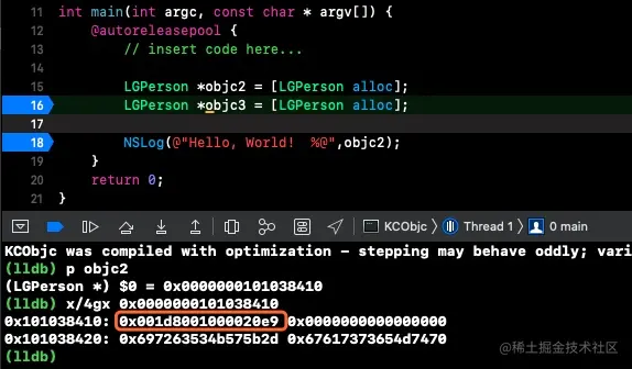 我们先拿到objc2的isa地址,上图中红色框中就是isa地址