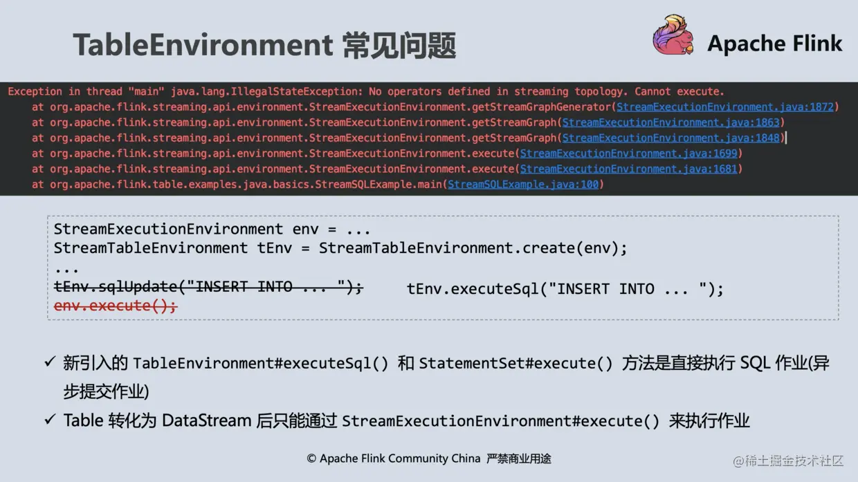 第一个常见报错是 No operators defined in streaming topology. 遇到这个问题的原因是在老版本中执行 INSERT INTO 语句的下面两个方法