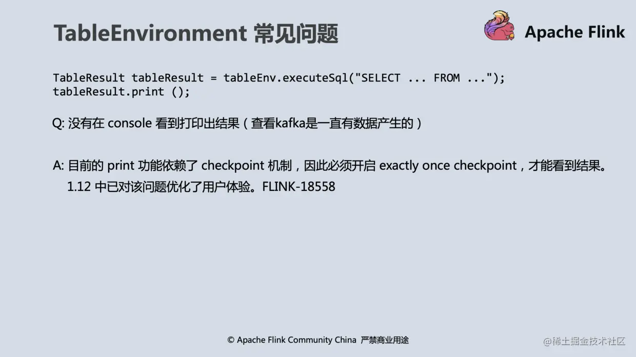 第二个问题是调用新的 TableEnvironemnt#executeSql() 后 print 没有看到返回值,原因是因为目前 print 依赖了 checkpoint 机制,开启 exactly-onece 后就可以了,新版本会优化此问题。