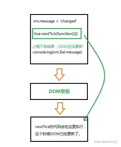 在下次 DOM 更新循环结束之后执行延迟回调。在修改数据之后立即使用这个方法,获取更新后的 DOM。 需要注意的是,在 created 和 mounted 阶段,如果需要操作渲染后的试图,也要使用 nextTick 方法。