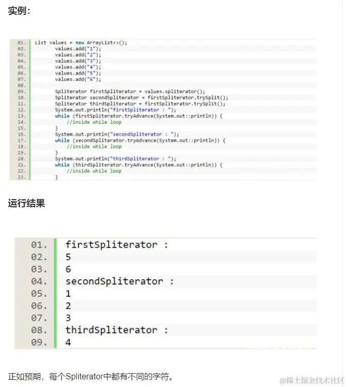 如果我们调用trySplit一个分隔符,它将返回一个分隔符,其中包含调用方分隔符不会覆盖的元素。这就是说,我们用它将分离器分成多个部分。这样做的主要好处trySplit是我们可以并行处理分割的元素。trySplit如果源包含有限数量的元素,则重复调用将返回null