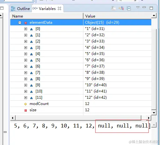 5、 elementData数组大小,大于等于列表的实际大小size。一个列表插入12个数据,数组整个长度15,实际大小size是12