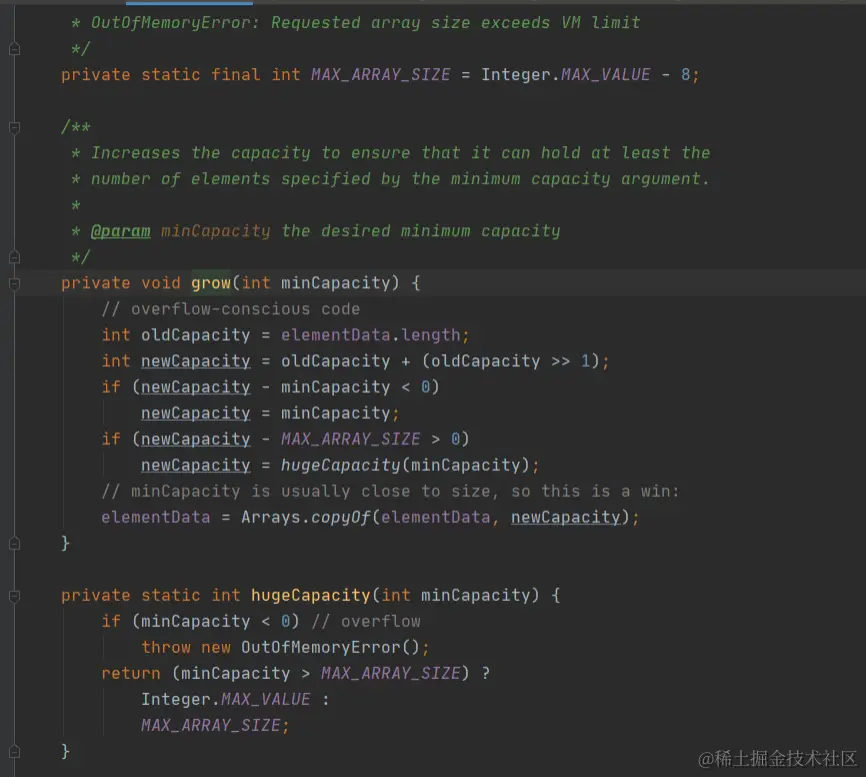 8、看上图,最大容量是Integer.MAX_VALUE,但是默认会使用Integer.MAX_VALUE -8 。原因是为了减少出错的几率,注释上写了,因为虚拟机中,对象头里的markword classpointer需要占用内存。