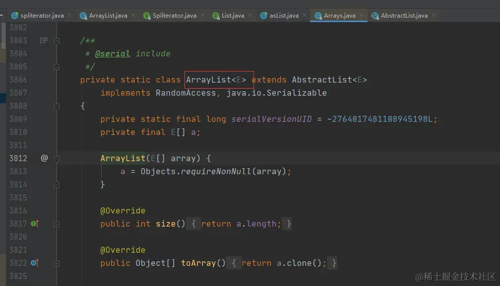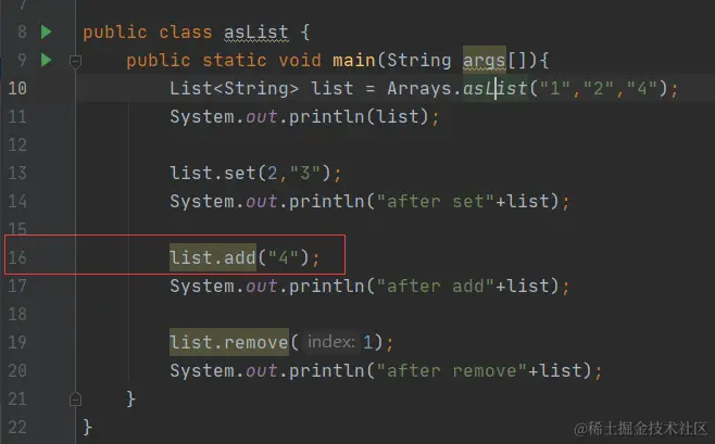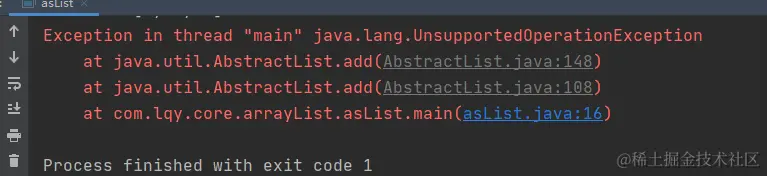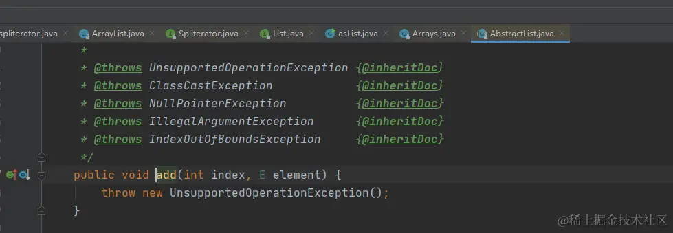 17、 ArrayList list = Arrays.asList("1“,”2”);很方便创建一个list对象,但是该list不能add,remove这些操作,因为此时返回list是AbstracList类的一个内部类,而不是真正的ArrayList。