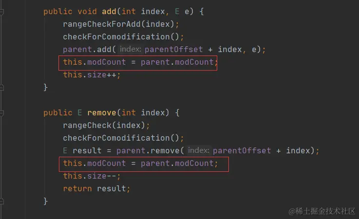 原因看下图:subList里面的数据更改函数,会将自己的modCount同步原始List的modCount;但是原始List的add或remove函数,modCount不会同步给subList, 也就导致了subList会出现CurrentModificationException; 原始List的set函数只改了数据,为改变modCount,也就不会出错,此时原始List和subList的数据都改变了
