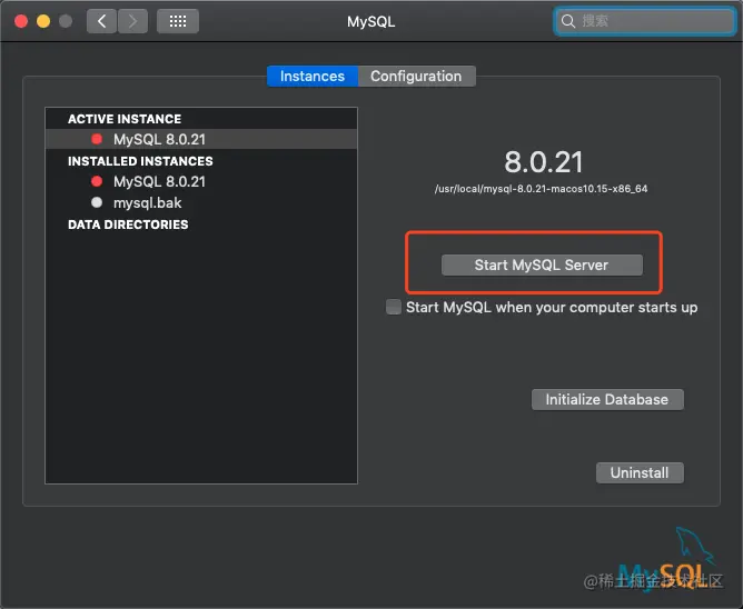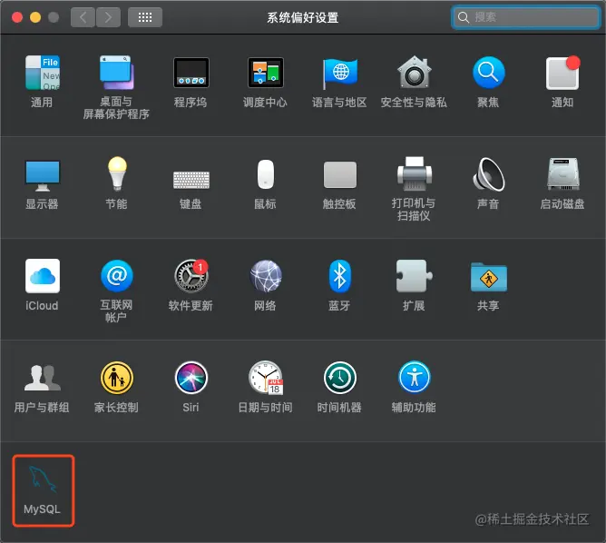 打开 "系统偏好设置", 找到mysql图标, 点击, 启动mysql服务。