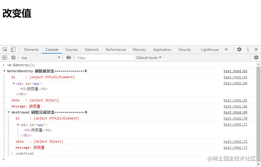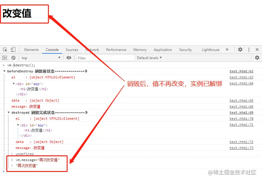 销毁后尝试更新值: 在控制台输入 vm.message='再次改变值',打印出来的内容如下: