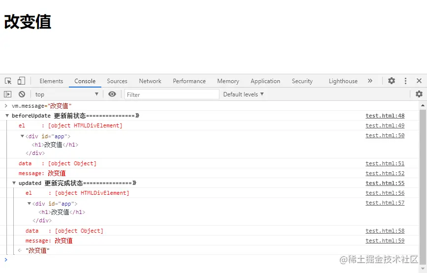 更新值: 在控制台输入 vm.message='改变值',打印出来的内容如下: