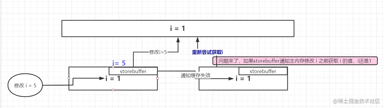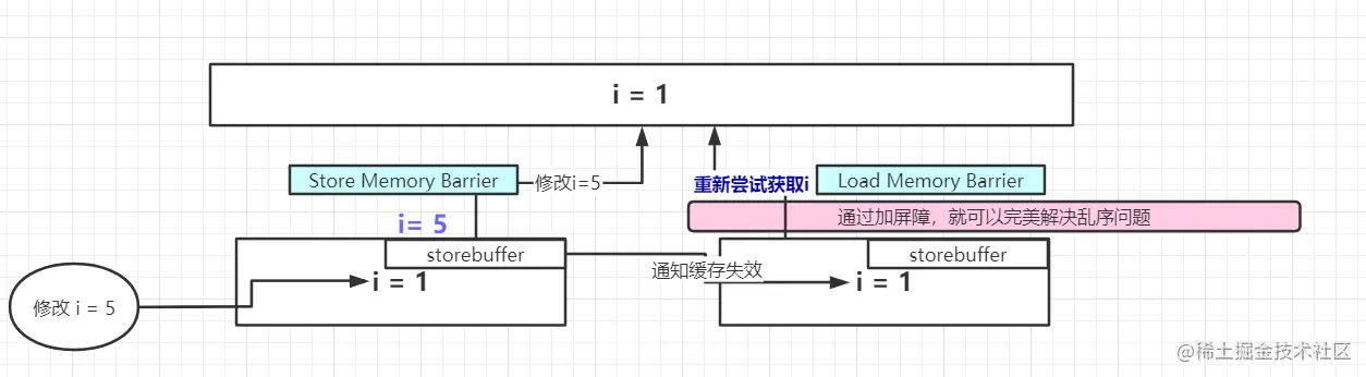 - 引入了storebufferes后,处理器会先尝试从storebuffer中读取值,如果storebuffer中有数据,则直接从storebuffer中读取,否则就再从缓存行中读取。