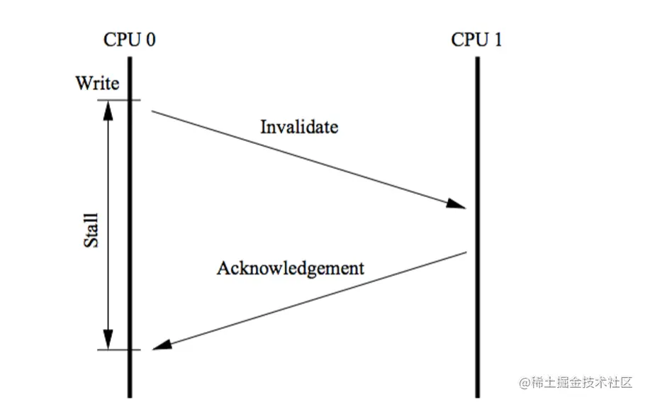 最先想到的办法就是通知其他 CPU 修改缓存数据的状态,并且要等到他们的确认回执,再把该数据写入到缓存中。