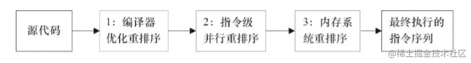为了提高程序的执行性能,编译器和处理器都会对指令做重排序,其中处理器的重排序在前面已经分析过了。所谓的重排序其实就是指执行的指令顺序。编译器的重排序指的是程序编写的指令在编译之后,指令可能会产生重排序来优化程序的执行性能。从源代码到最终执行的指令,可能会经过三种重排序。