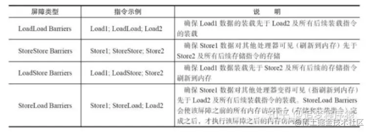 - Store Memory Barrier(写屏障) 告诉处理器在写屏障之前的所有已经存储在存储缓存(store bufferes)中的数据同步到主内存,简单来说就是使得写屏障之前的指令的结果对 屏障之后的读或者写是可见的