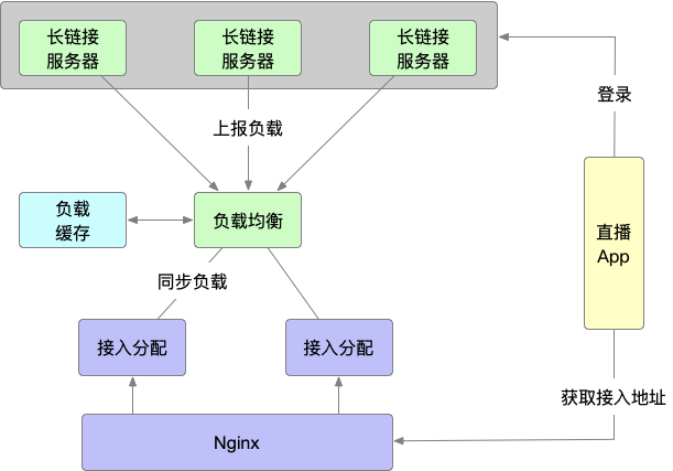 云信实现了一套基于服务器负载均衡的分配策略。长链接接入服务器周期性上报当前服务器负载到负载均衡服务集群,负载信息存储在共享缓存中,接入分配服务根据负载信息动态分配接入地址。