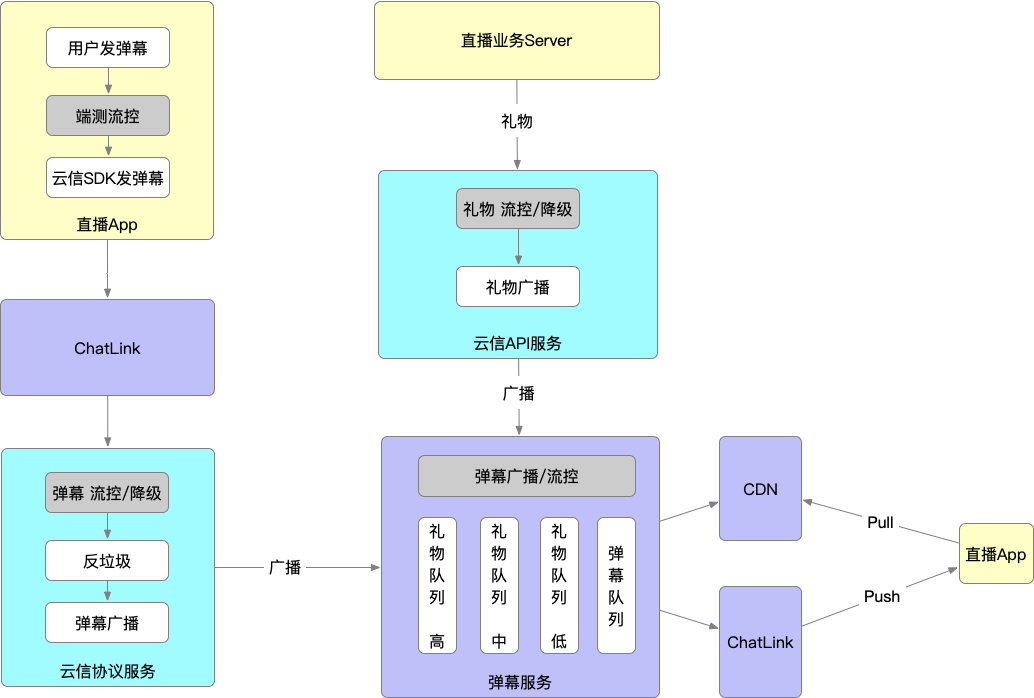弹幕方案以云信聊天室服务为基础,提供登录直播间、发送弹幕、礼物消息等能力;以千万级在线广播为目标,设计了基于CDN的弹幕广播服务。