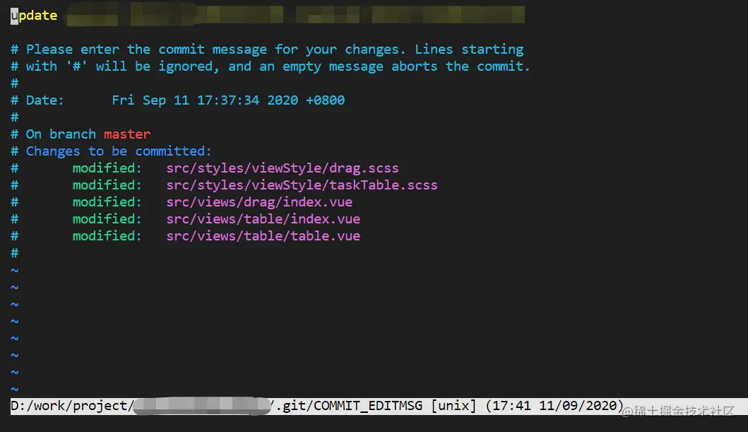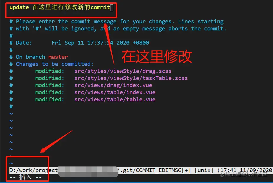 - 键盘点击i,控制台下方会出现“插入”,这时即可修改之前的commit内容