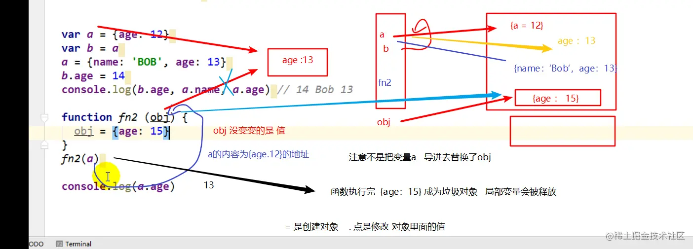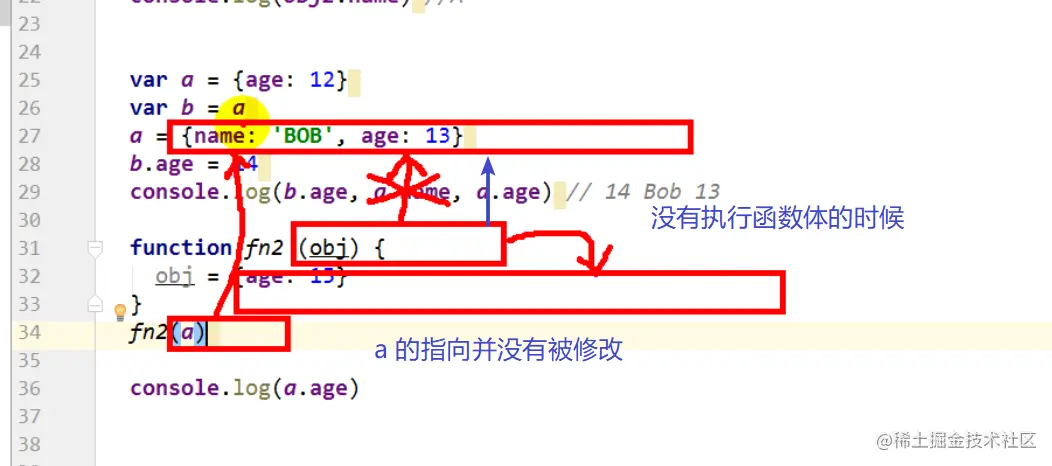 console.log(b.age, a.name, a.age)//20 "Bob" 13