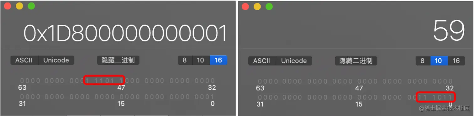 打开计算器并输入0x001d800000000001,从47位开始读取6位,将59转二进制,发现都为111011,如下图: