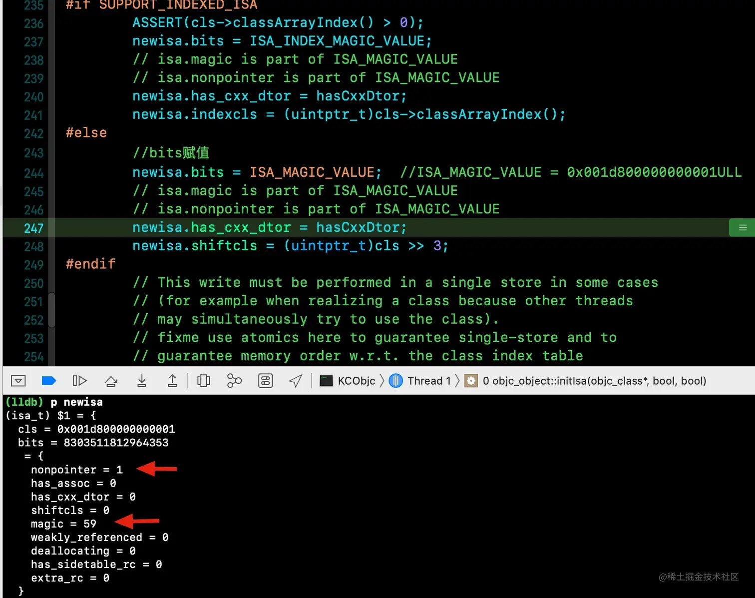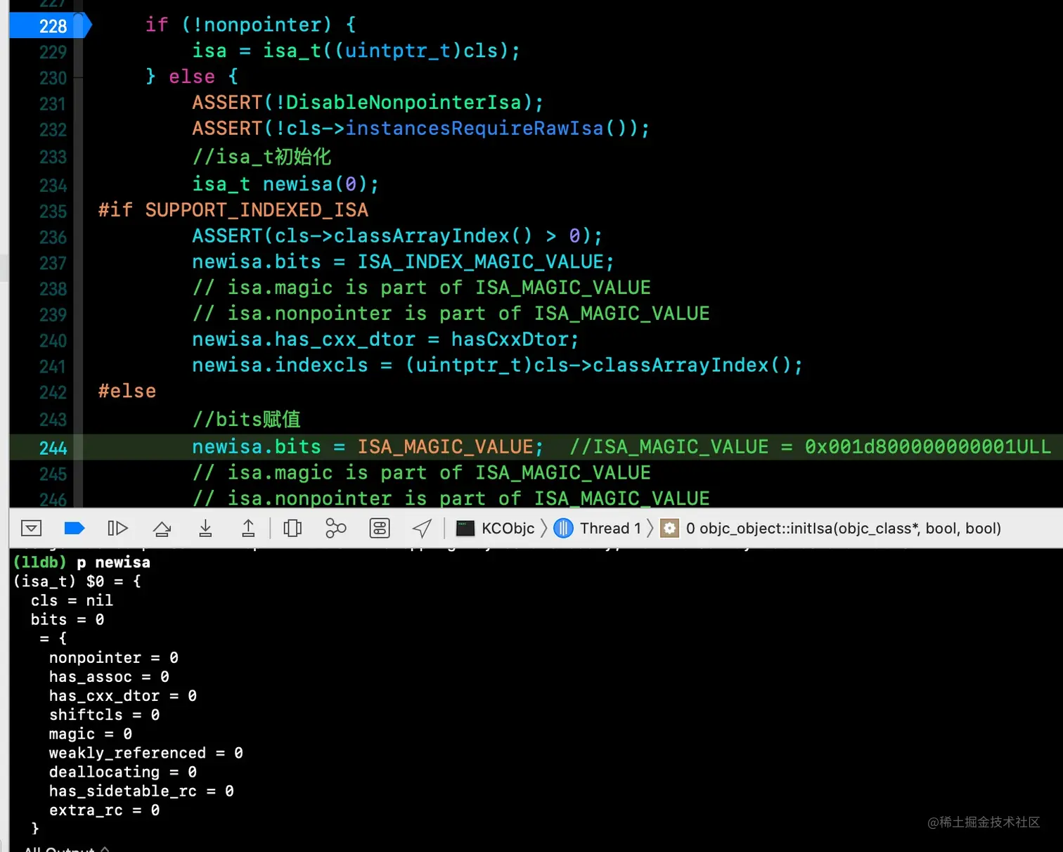 step over继续往下执行,走到newisa.bits = ISA_MAGIC_VALUE;这里给isa的bits成员赋值,重新执行lldb命令p newisa,打印结果如下: -