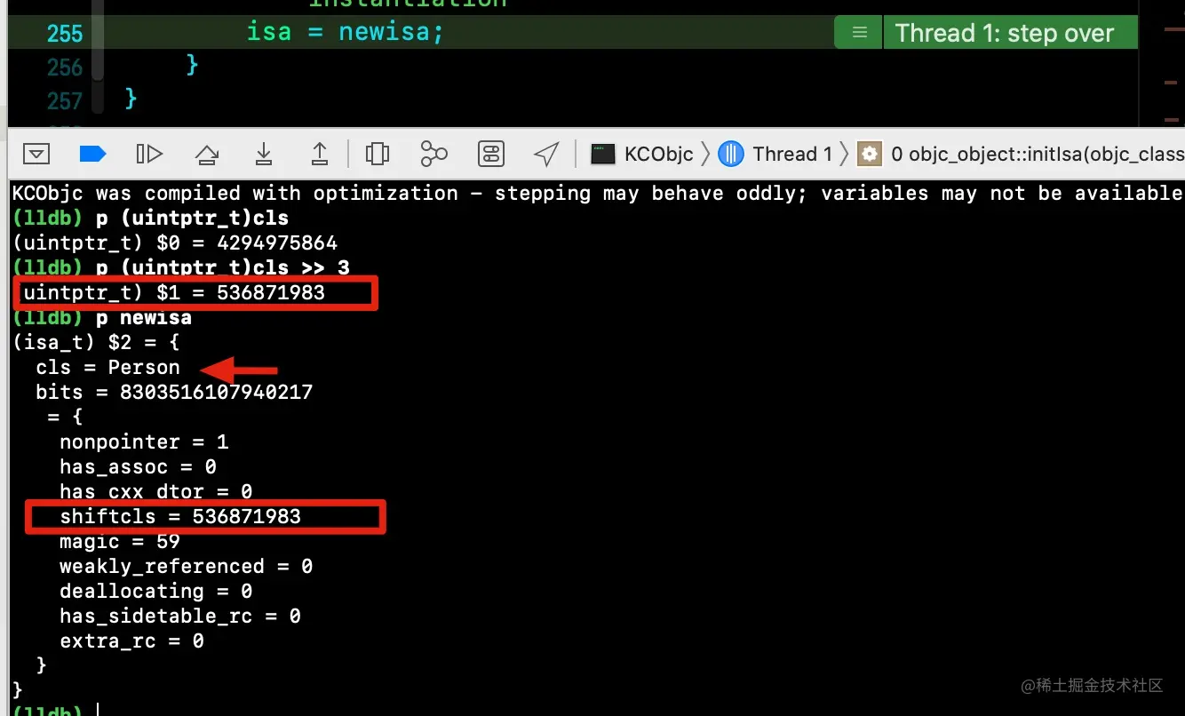 (uintptr_t)cls,执行lldb命令p (uintptr_t)cls >> 3,得到结果uintptr_t) $1 = 536871983 -