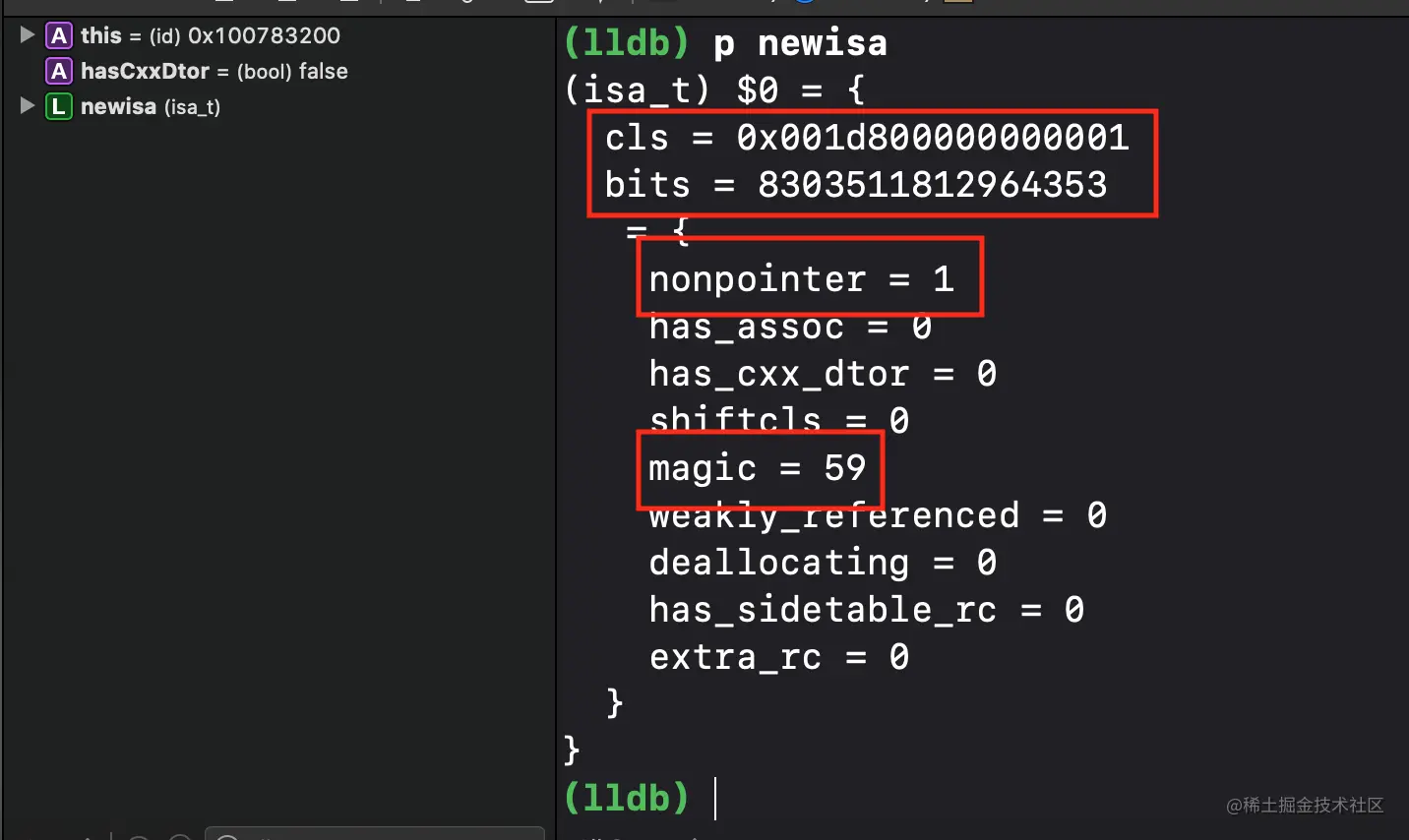 继续执行,走到newisa.bits = ISA_MAGIC_VALUE;下一行,表示为isa的bits成员赋值,重新执行lldb命令p newisa,得到的结果如下